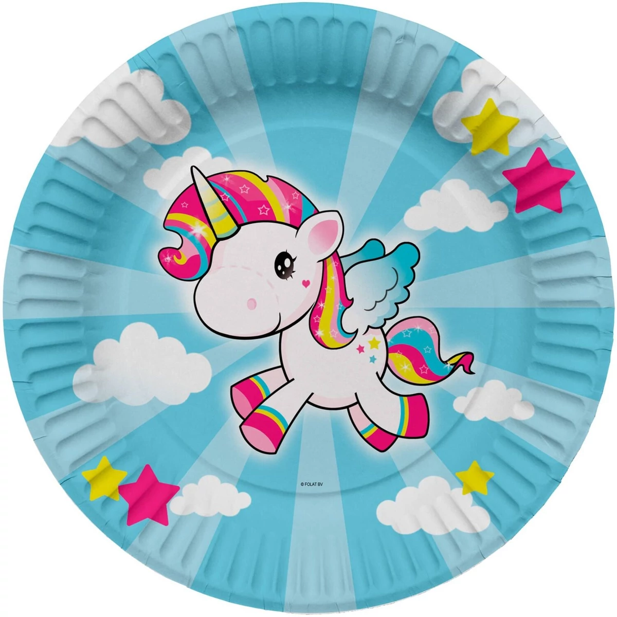 Kék alapon, színes egyszarvús papírtányér. 23 cm átmérőjű. 8 darab/csomag.