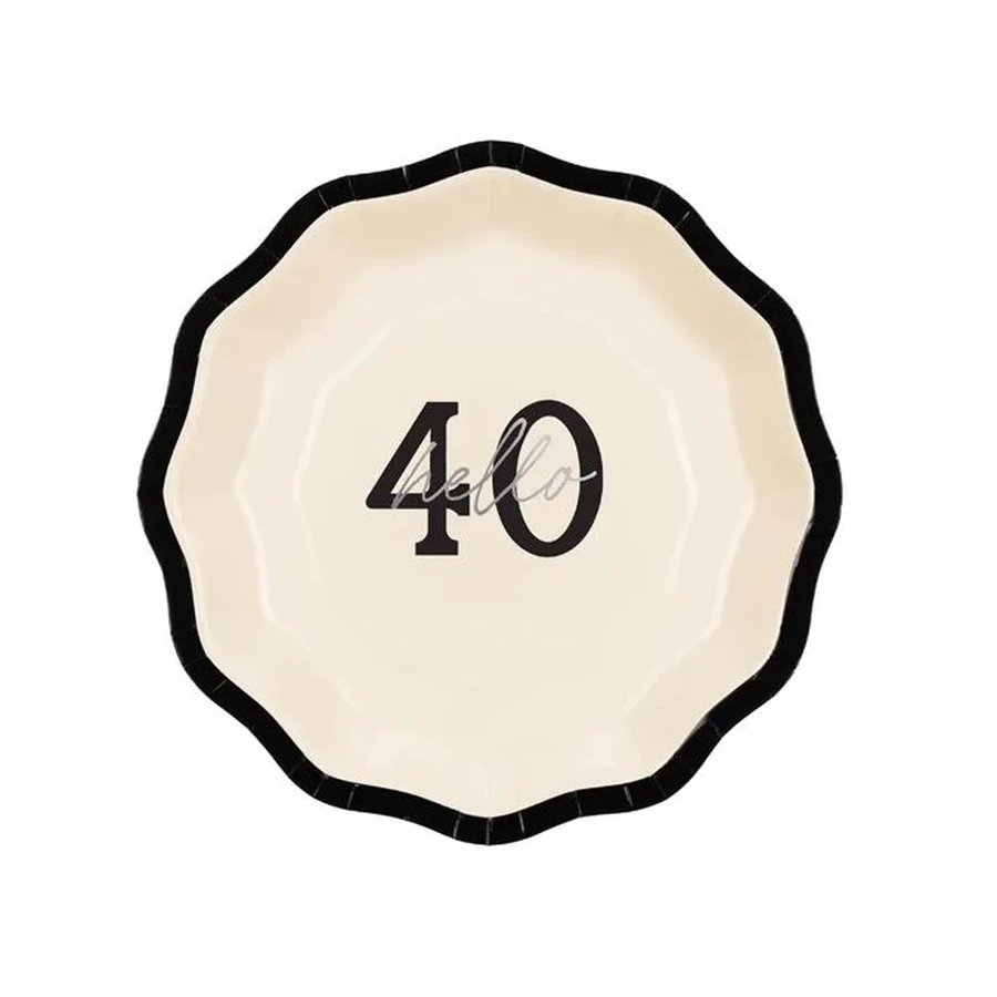 Fekete-fehér színű, Hello 40 feliratú papírtányér. 6 darab/csomag.
