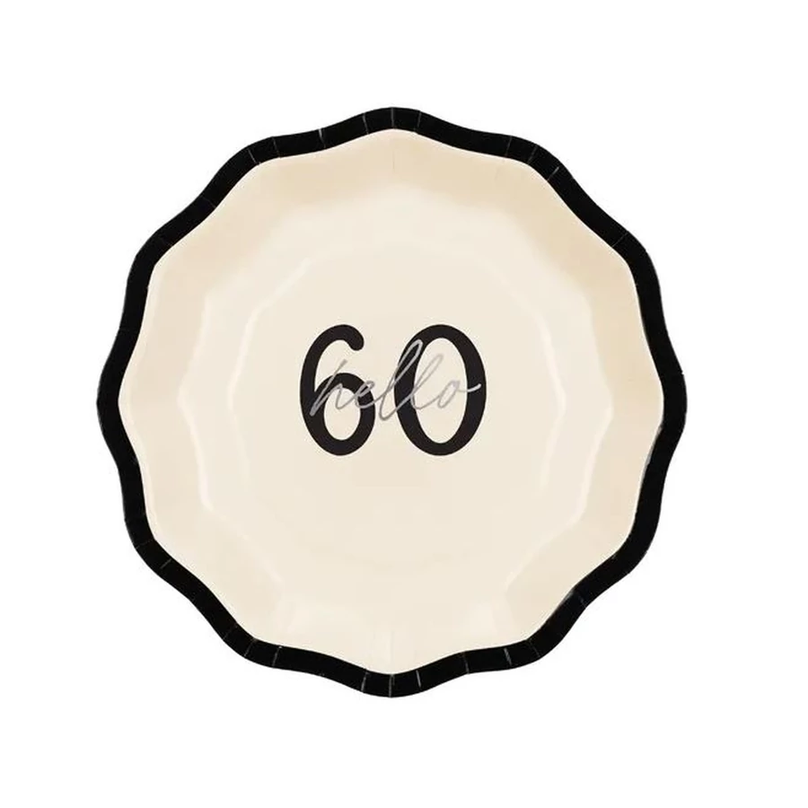 Fekete-fehér színű, Hello 60 feliratú papírtányér. 6 darab/csomag.