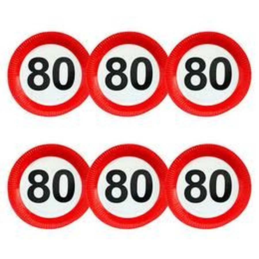 80-as/80. Sebességkorlátozó Közlekedési Tábla Számos Szülinapi/Születésnapi Parti Tányér - 23 cm, 6 db-os