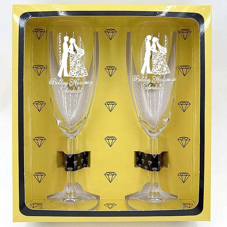 Ajándék Házassági Évfordulóra. Stílusos páros pezsgőspohár szett. A két darab kiváló minőségű pohár egy elegáns, díszes dobozban érkezik, amely tökéletes ajándékozáshoz. A pohár elegáns dizájnnal és "Boldog Házassási Évfordulót" felirattal rendelkezik, így kiválóan alkalmas évfordulós ajándéknak.