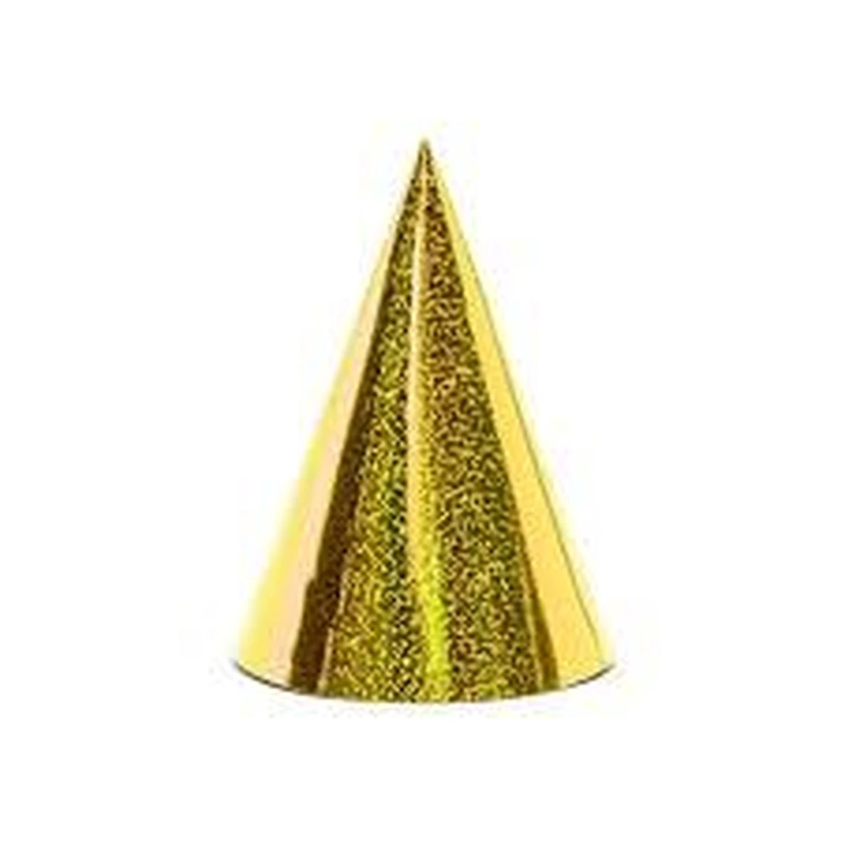 Holografikus arany parti csákók, 6 darabos csomag. 16 cm nagyságú, 10 cm átmérőjű.
