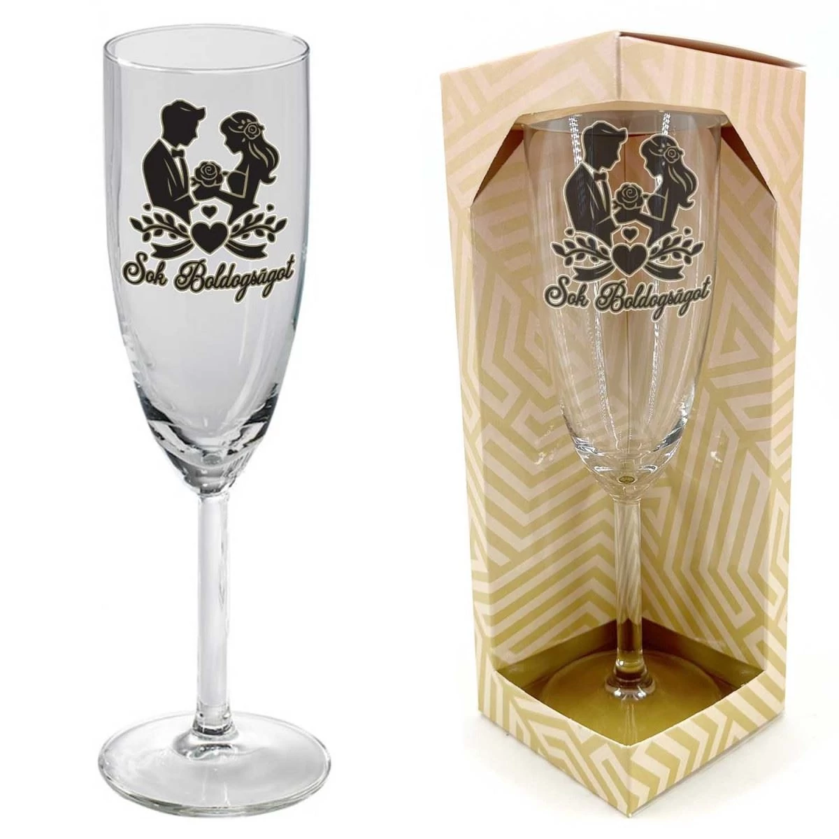 Pezsgőspohár Sok Boldogságot! felirattal, esküvői pár motívummal.