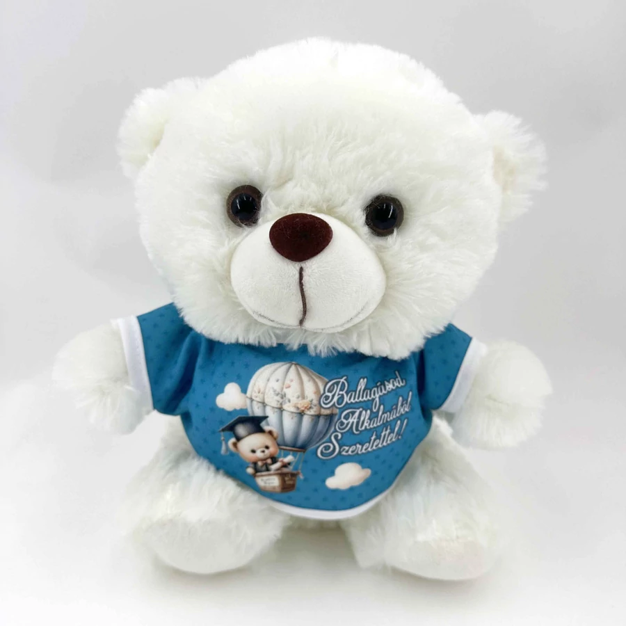 Plüss maci fehér feliratos pólóval - Ballagásod Alkalmából Szertettel - Ajándék Ballagásra 25cm