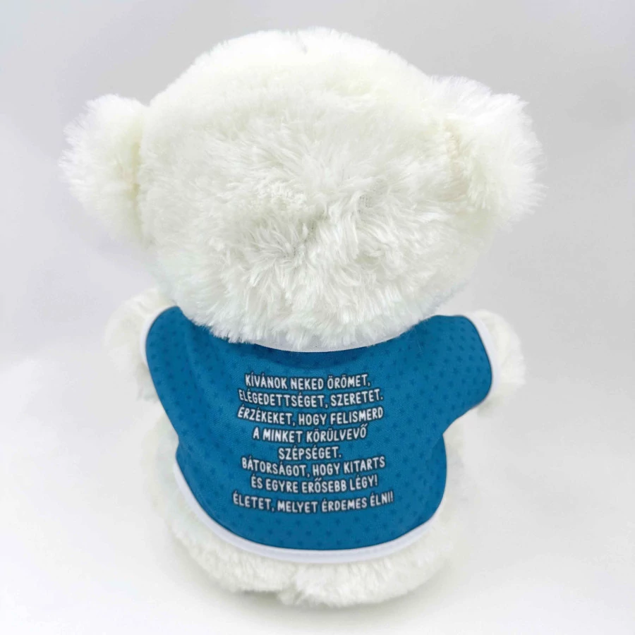 A puha, fehér plüss maci egy stílusos, feliratos pólót visel, amely különlegessé és személyessé teszi az ajándékot.