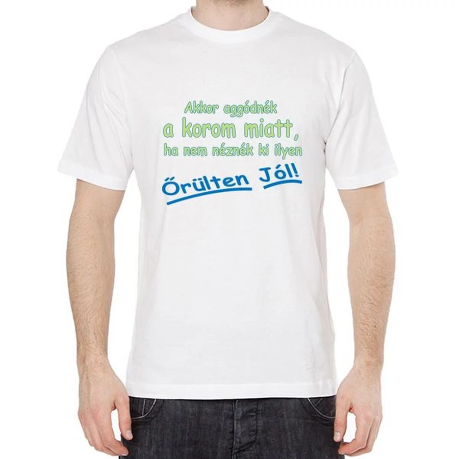 Fehér, "M" méretű póló "Akkor aggódnék a korom miatt, ha nem néznék ki ilyen őrülten jól!" felirattal.