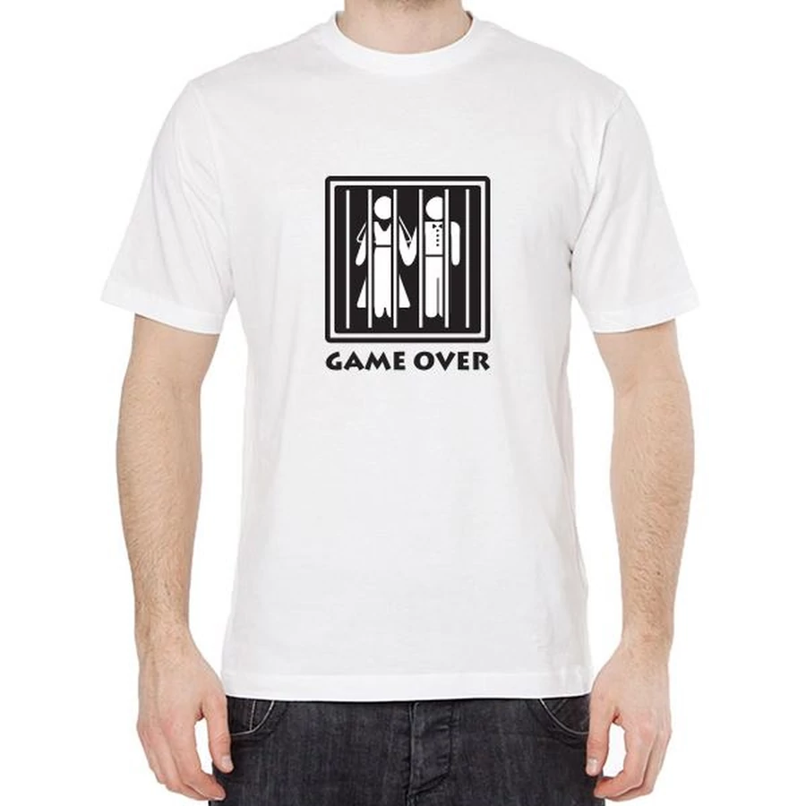 Game over feliratú, börtönös ábrázolású, fehér alapú póló, XXl méretben.