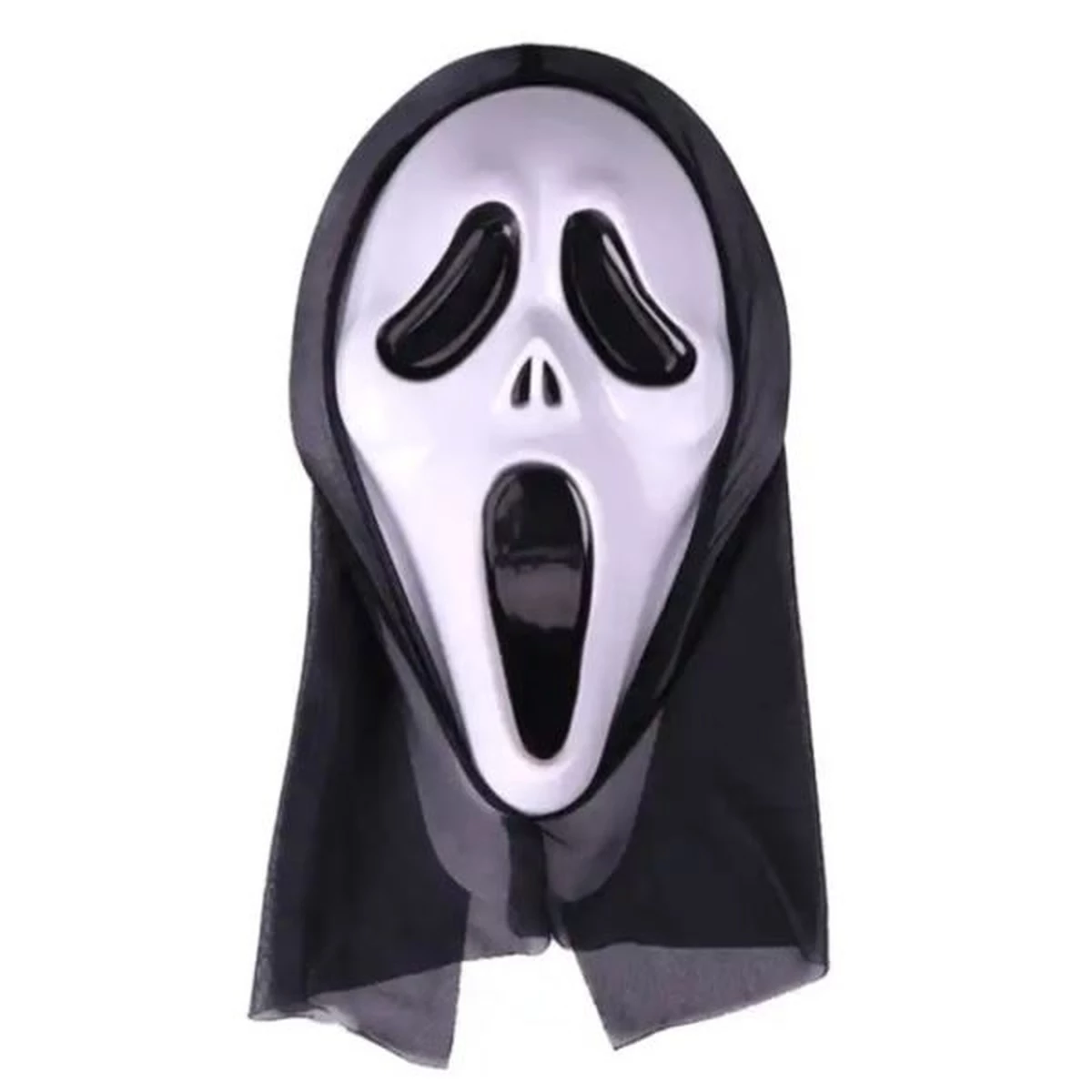 Műanyag sikoly álarc, fekete csuklyával.