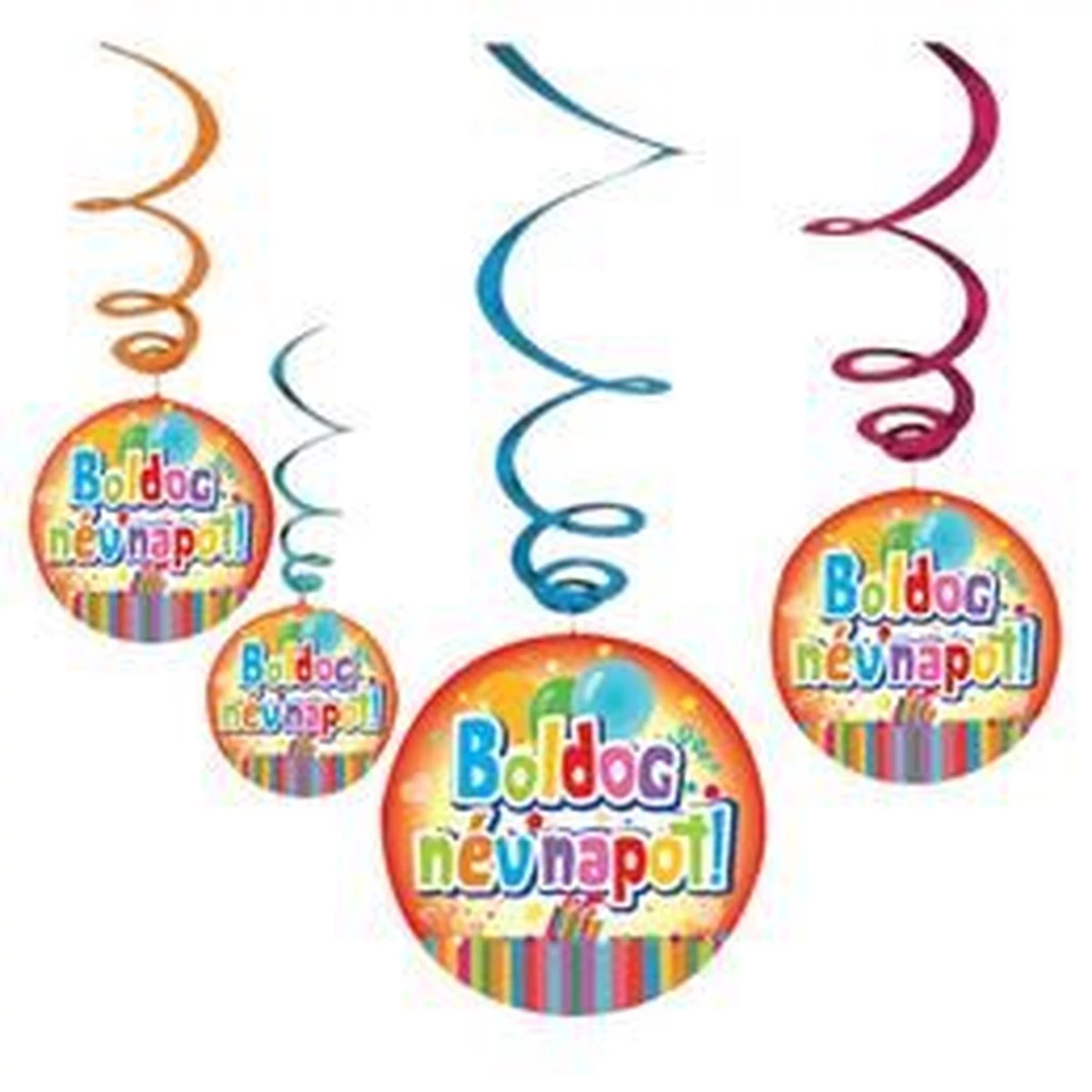 Színes, Boldog Névnapot Feliratos Karton dekoráció sárga, rózsaszín, sötétkék, piros, világoskék és zöld spirálon.