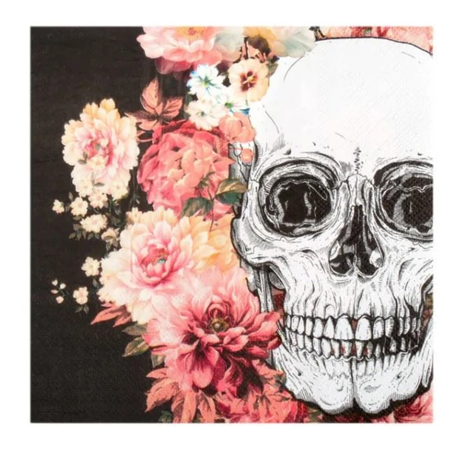 Halottak napja szalvéta, koponya és színes virág díszítéssel.