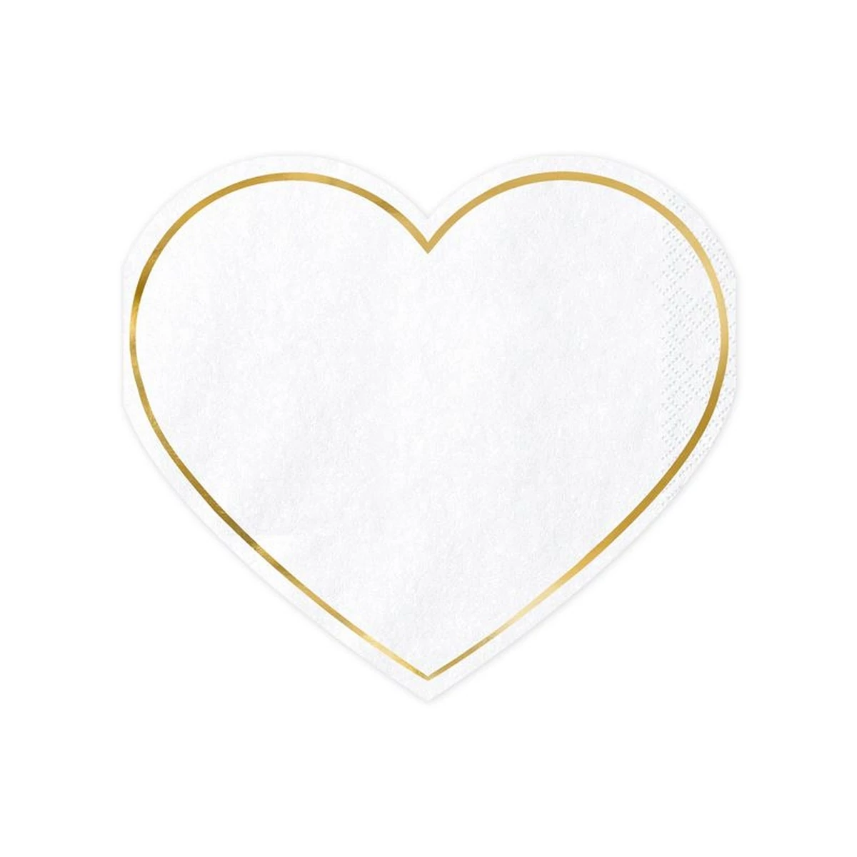 Szív alakú papírszalvéták fehér színben, metál arany nyomattal, mérete kibontás után kb. 28,5 x 25 cm, mérete összehajtás után kb. 14,5 x 12,5 cm.