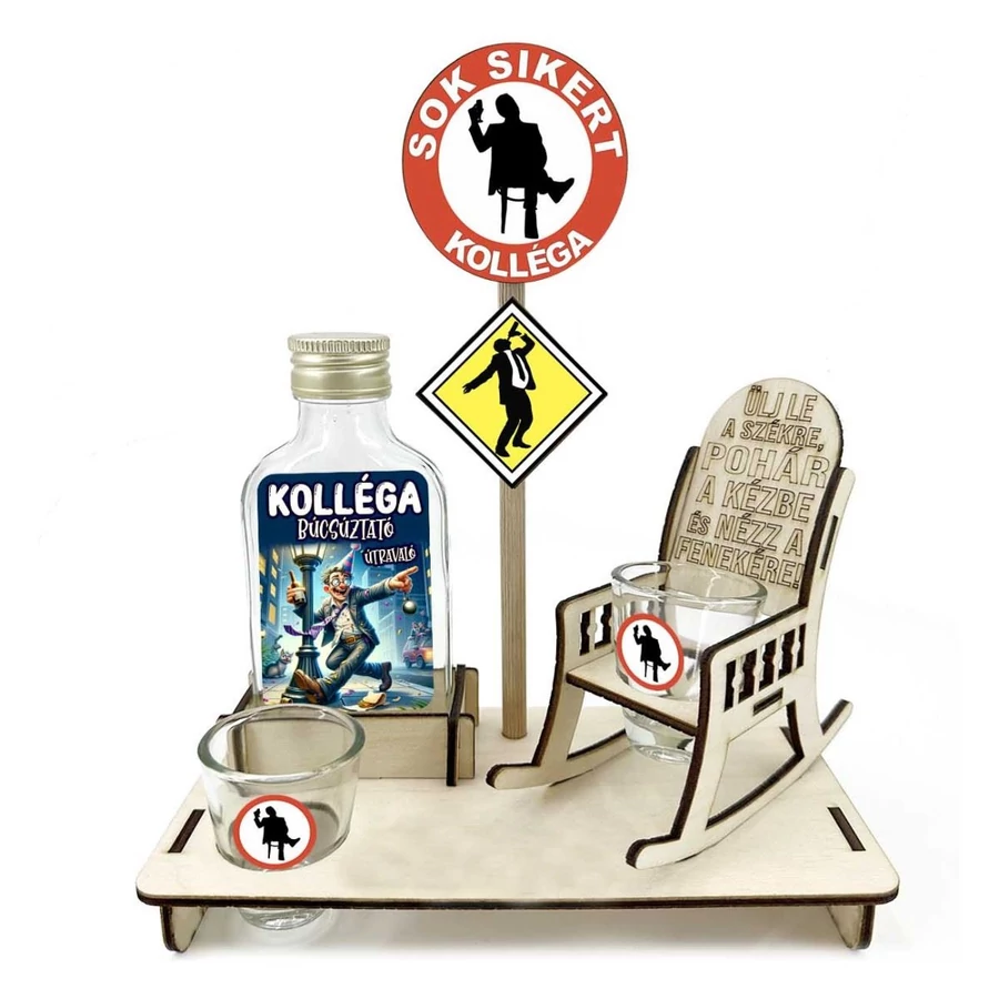 Kolléga búcsúztató Ajándék. A vicces székes pálinkás szett, egy remek ajándék ötlet kolléga búcsúztatóra. Remek dekorációs kiegészítő, amely garantáltan emeli a pálinkázás szórakoztató szintjét. Az egyedi és vicces dizájn a pálinkás szettet sokkal többé teszi egy egyszerű italkínálónál.
