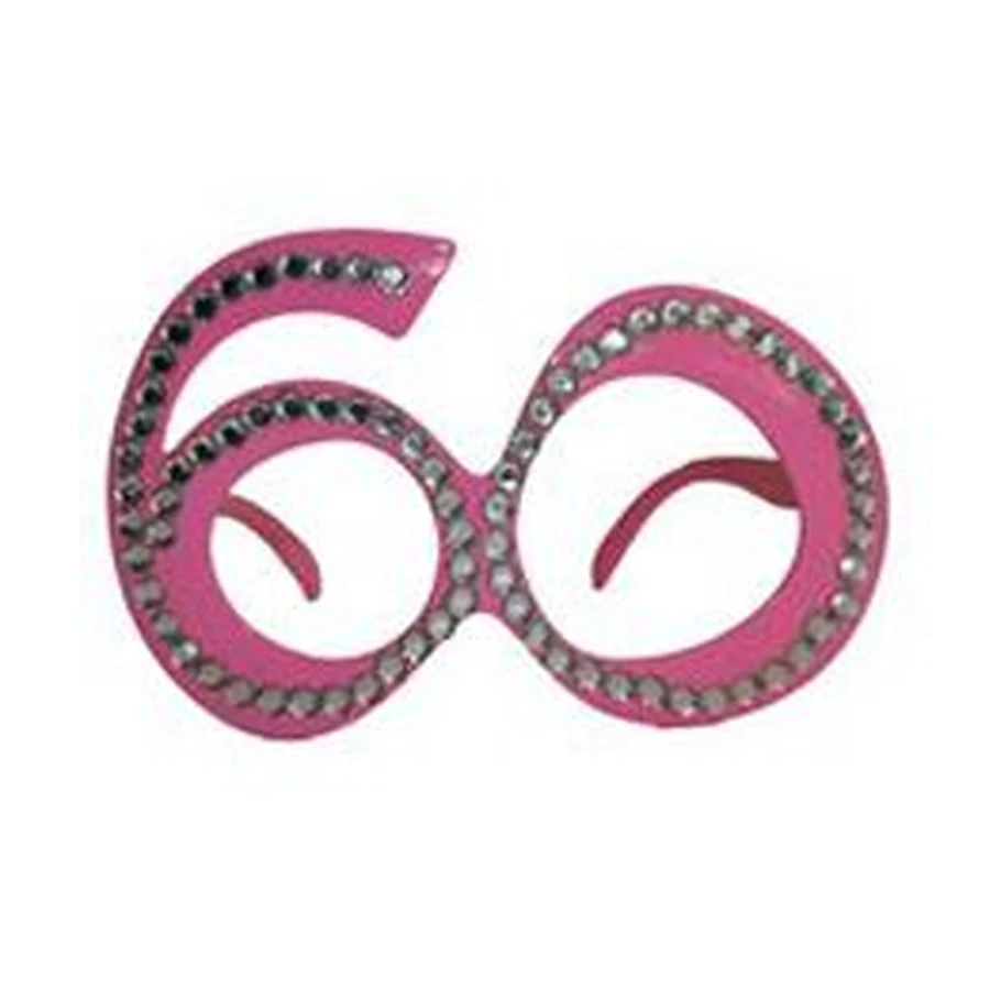 Rózsaszín műanyagból készült, 60-as számot formázó, lencse nélküli szemüveg keret, strasszkövekkel díszítve.