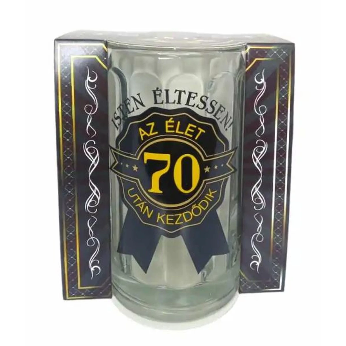 Az élet 70 év után kezdődik. feliratú sörös korsó.