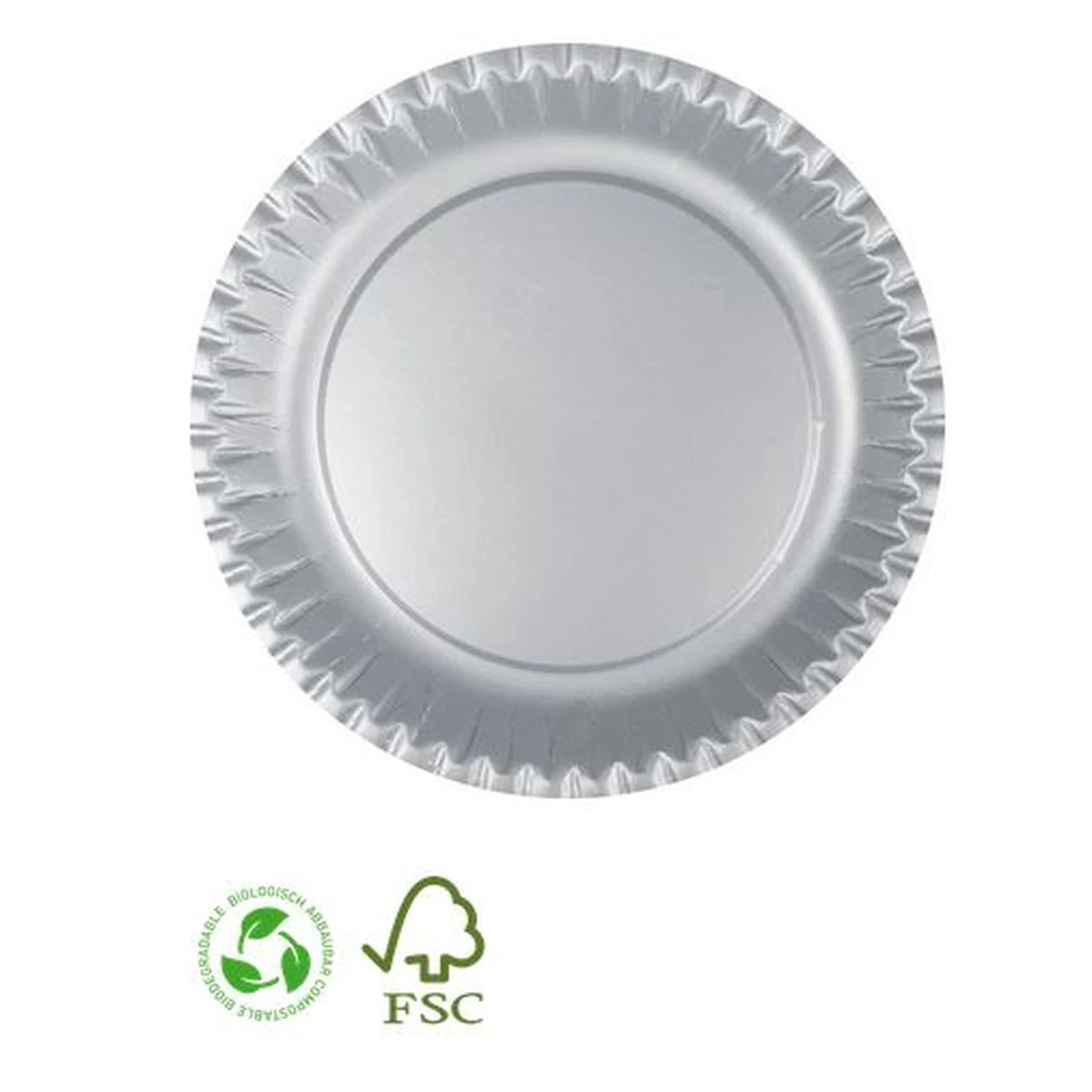 1 csomagban 10db ezüst színű papírtányér van, 23 cm átmérőjű.