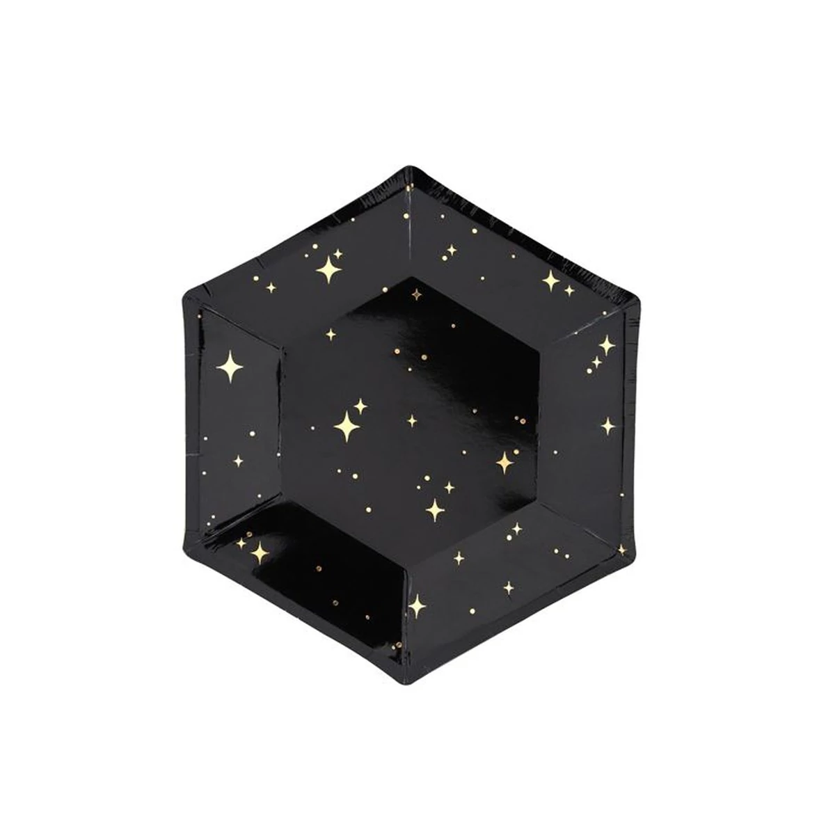 Papírtányérok Ünnepeljünk fekete színben, arany mintával, átmérője kb. 20 cm.