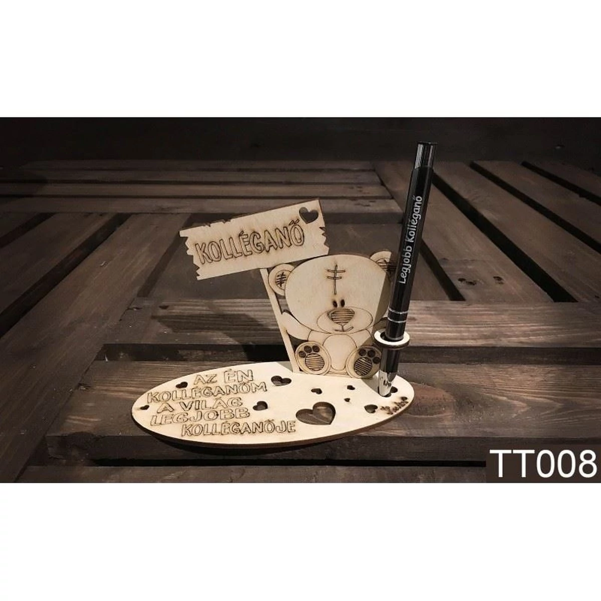 Otthonra, a munkahelyre hasznos ajándék az íróasztalra az ajándékozottnak. Fából készült tolltartó, melyen egy maci tartja a tollat, a fába gravírozott kedves felirat olvasható.