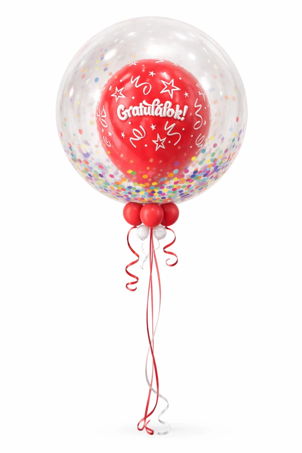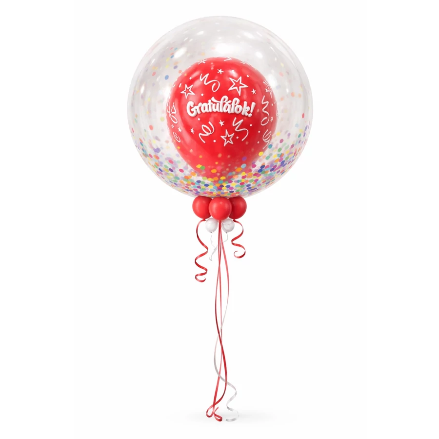A külső réteg egy átlátszó, nagy méretű bubble lufi, amelynek alját színes konfetti mintázat díszíti, így játékos és elegáns megjelenést ad.