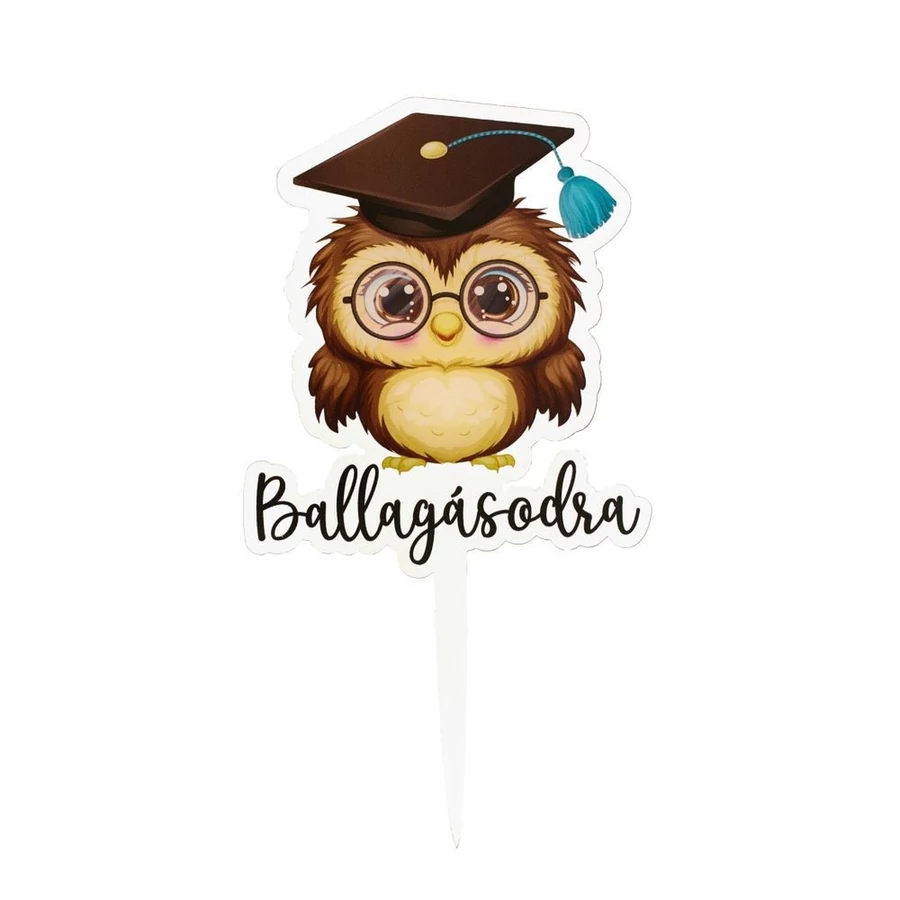 Műanyag tortadísz, beszúró - Ballagásodra felirattal, bagoly mintával.