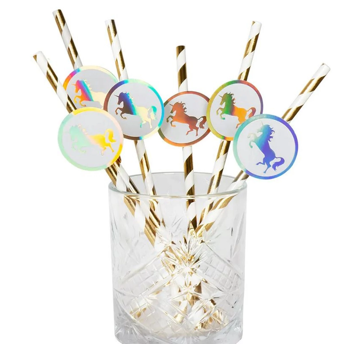 Fényes Unikornis - Egyszarvú Parti Papír Szívószál - 6 db-os, Fénylő, Csillogó, Unicorn, Csíkos