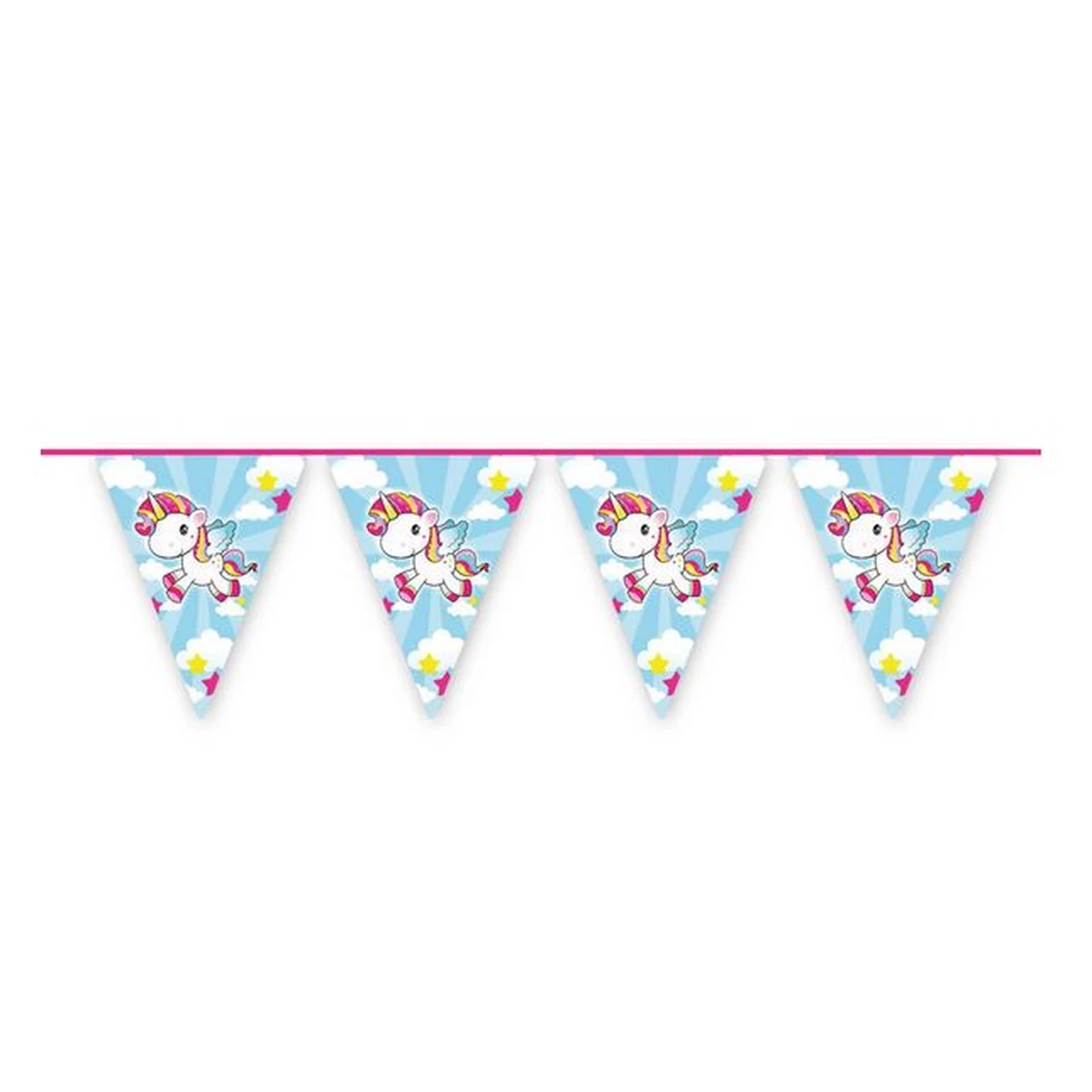 Színes, vidám, egyszarvú mintás zászlófüzér.
