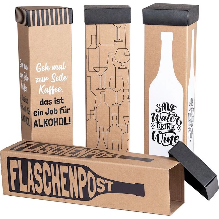 Üvegtartó díszdoboz, többféle mintával és felirattal. 34 x 9 x 9 cm-es. Papír.