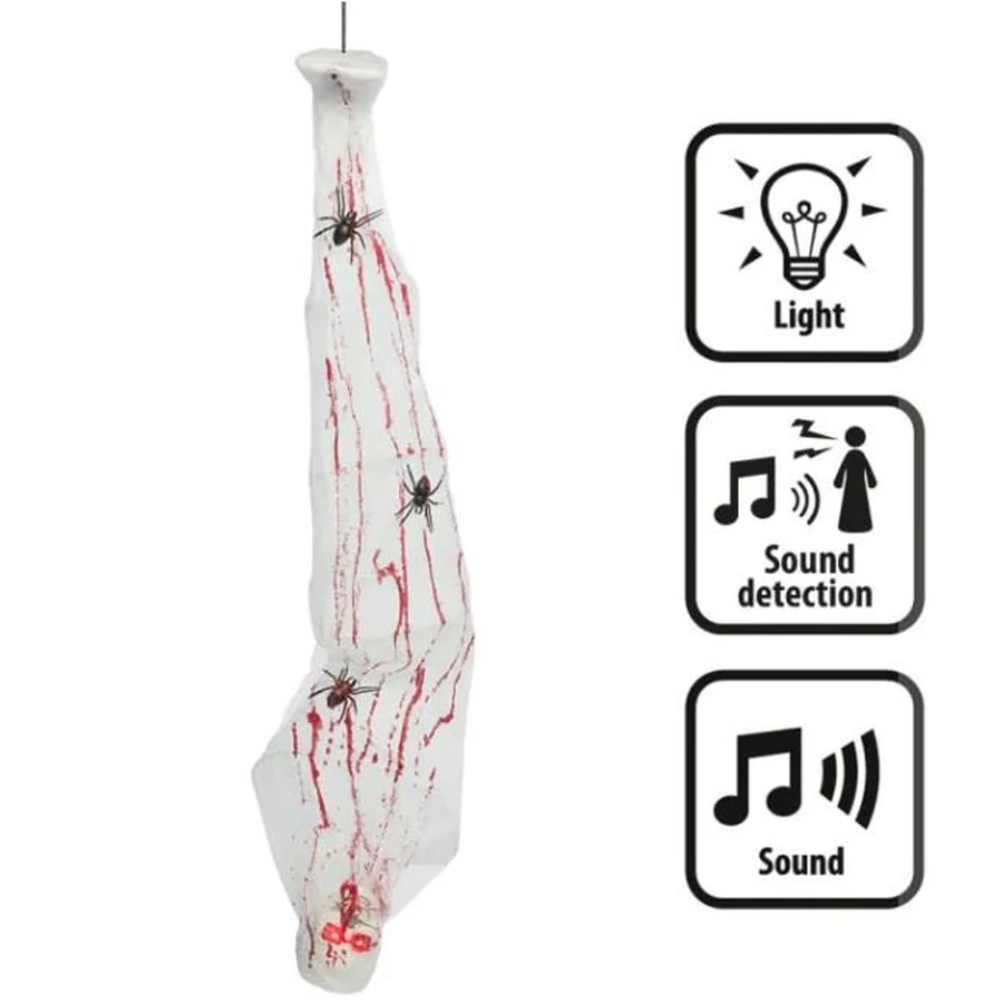 165 cm nagyságú, világító, hangot adó véres-pókos múmia.