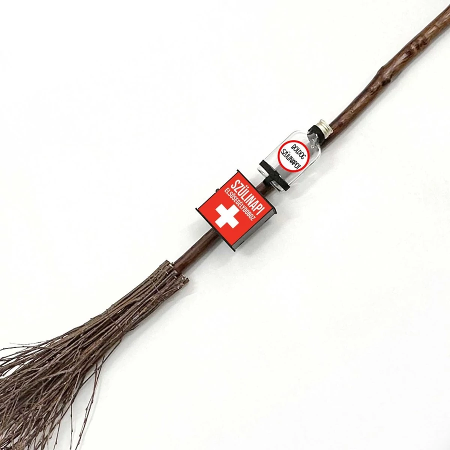 A seprű részeként tartozik hozzá egy csengő, pálinkás laposüveg és egy elsősegély doboz. Az elsősegély doboz: fa fütyit, óvszert, fecskendőt tartalmaz, ami még humorosabbá teszi az ajándékot.
