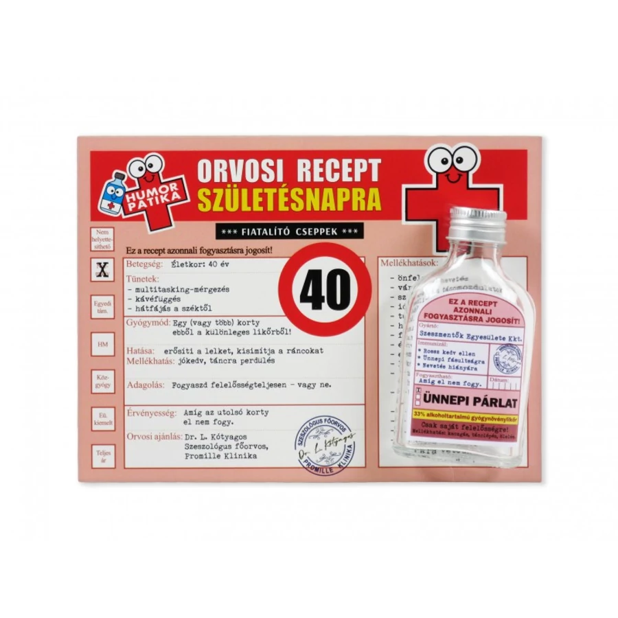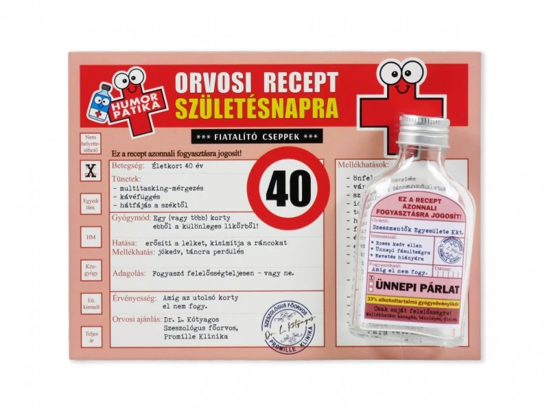 Vicces orvosi recept + flaska 40. Születésnapra 20x15cm