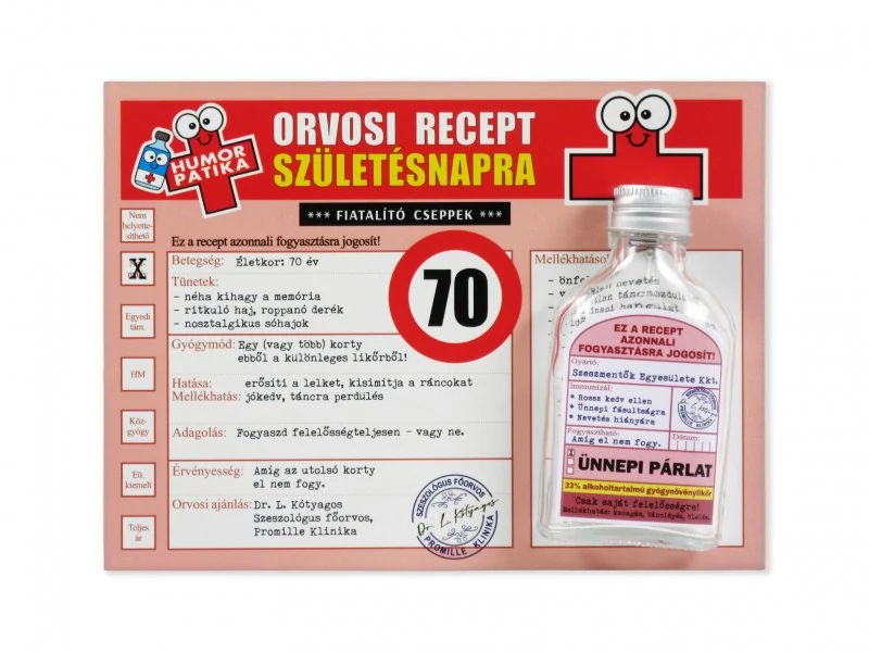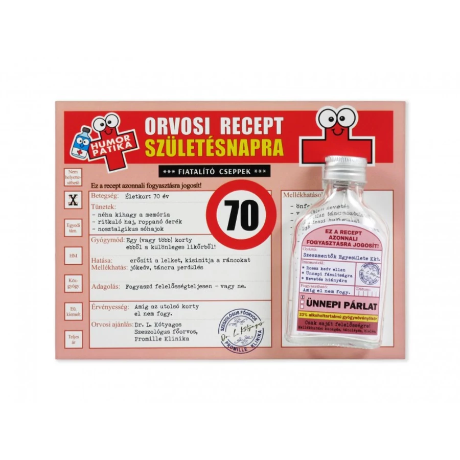 Vicces orvosi recept + flaska 70. Születésnapra 20x15cm