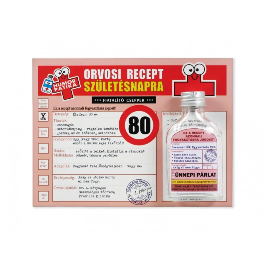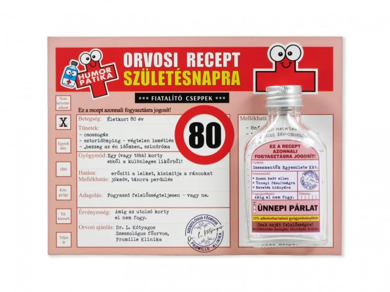 Vicces orvosi recept + flaska 80. Születésnapra 20x15cm