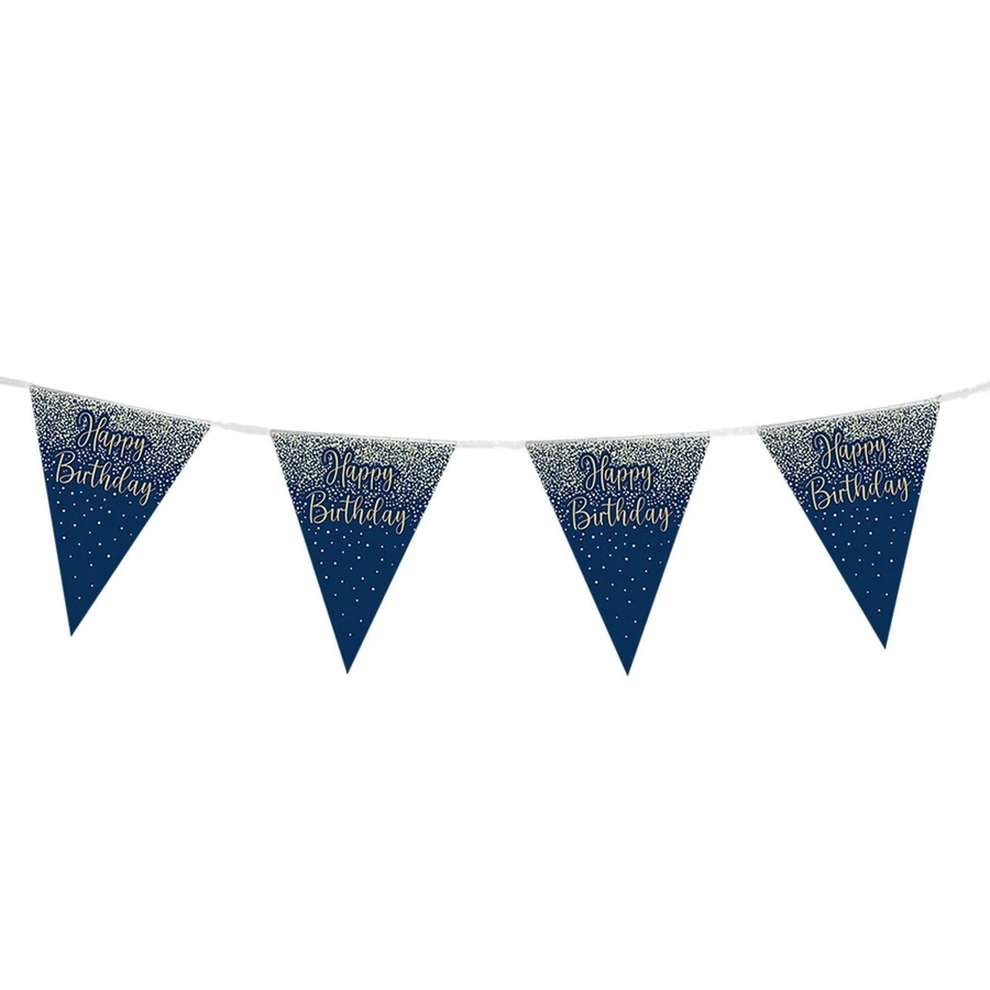 Sötétkék alapon, arany Happy Birthday feliratos zászlófüzér.