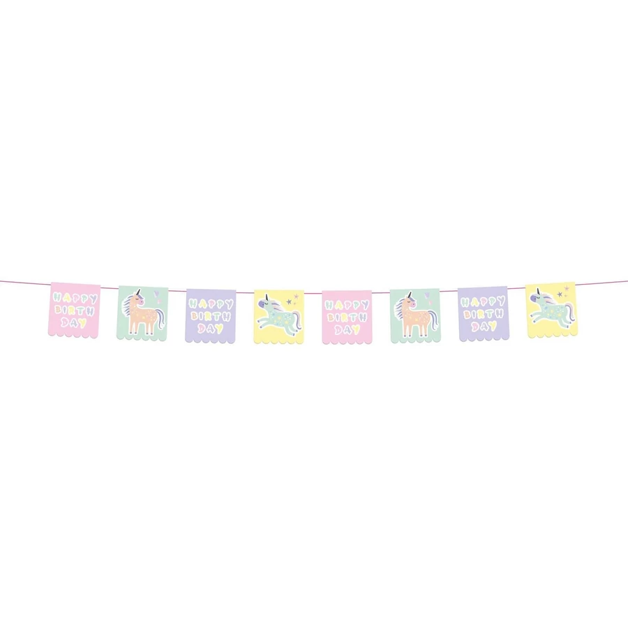 Happy Birthday feliratos, unikornisos zászlófüzér. 6 méter hosszúságú, 21 cm nagyságú.