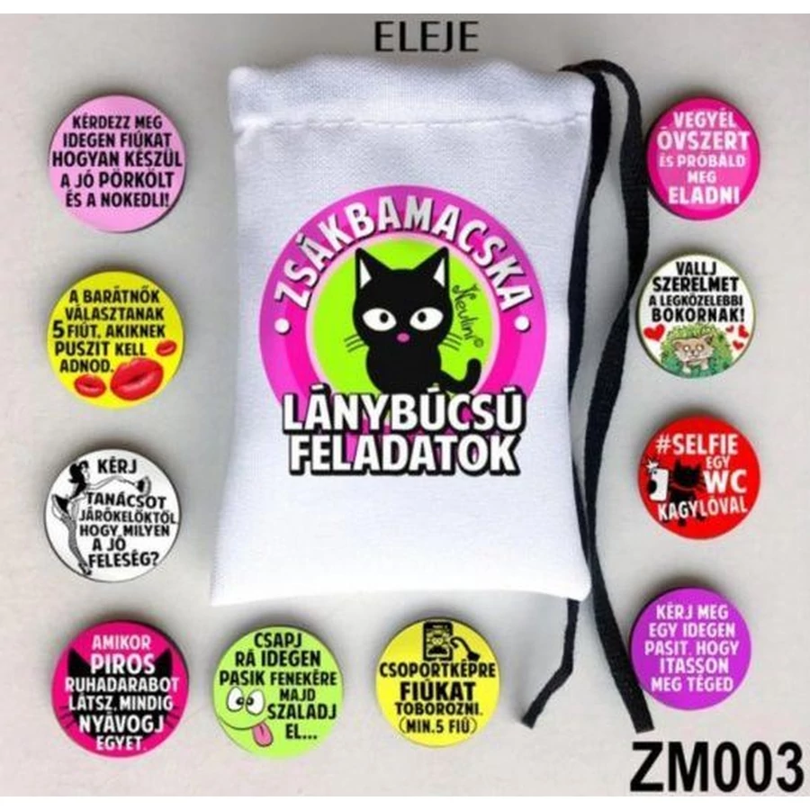 A zsákbamacskában 10 feladat korong van, amit a férjhez menő lánykának kell kihúzni egyesével a zsákocskából és csak akkor húzhat újat, ha teljesítette a feladatát!